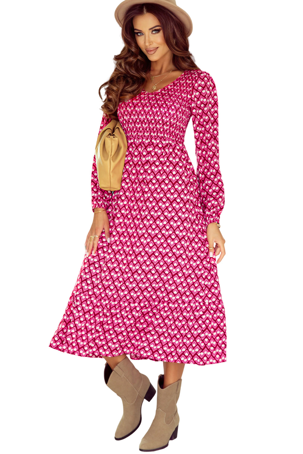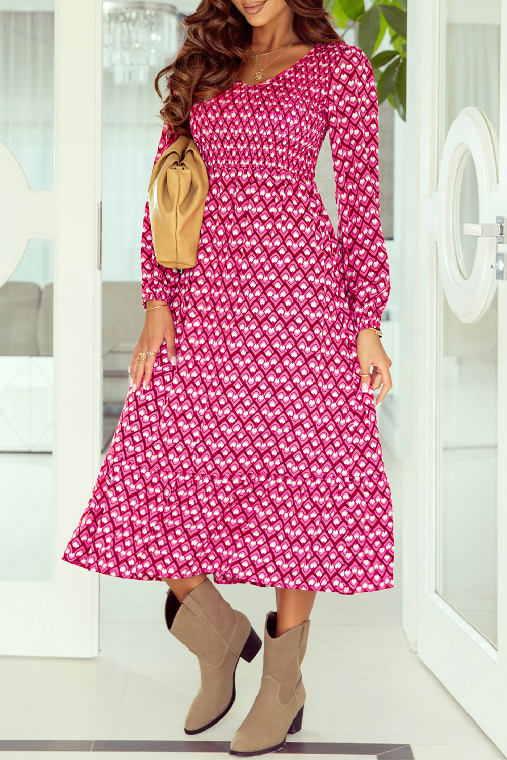 ชุดเดรสยาวเอวสูงคอวีพิมพ์ลาย Geometric