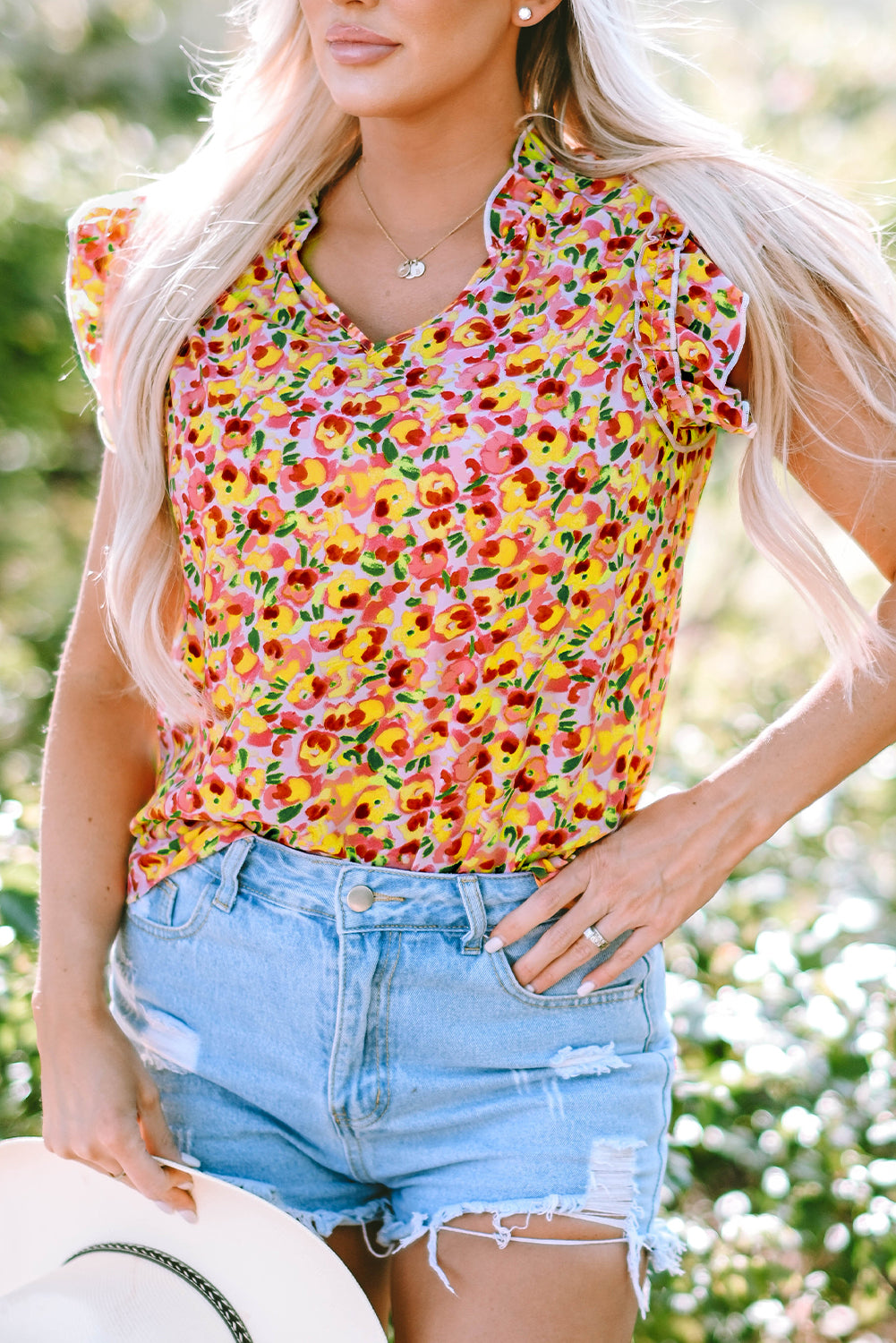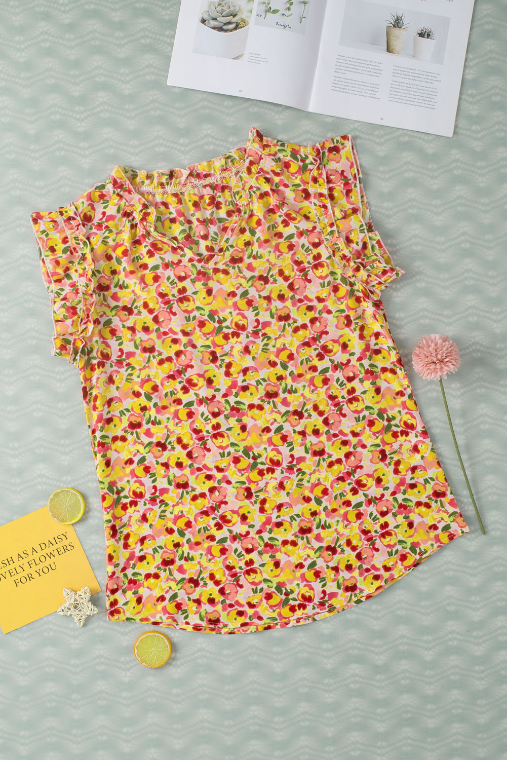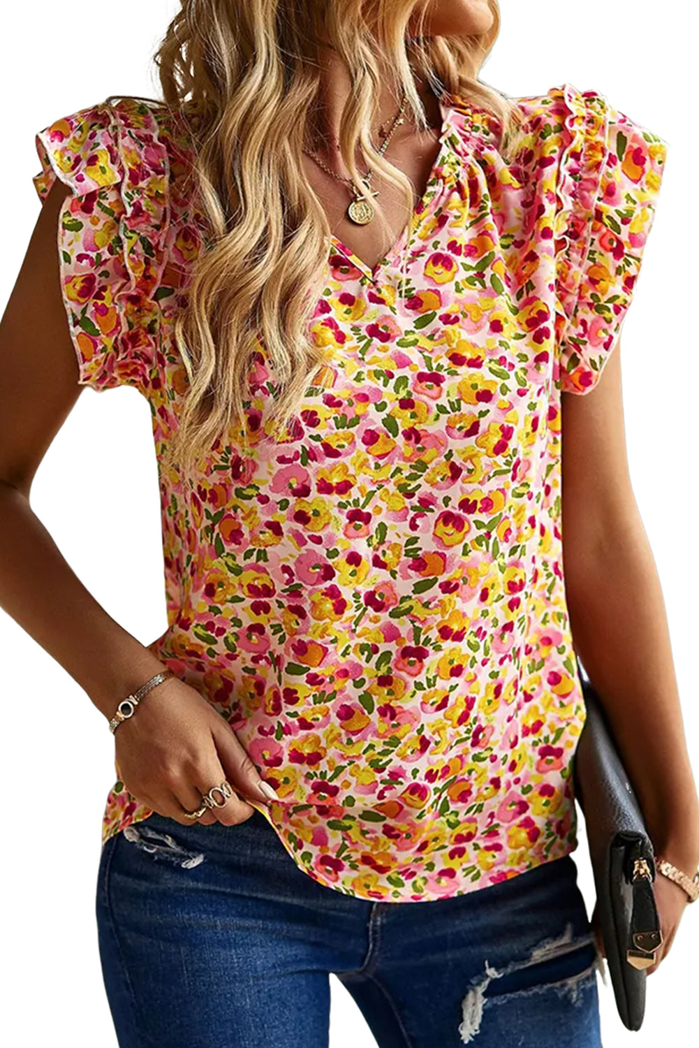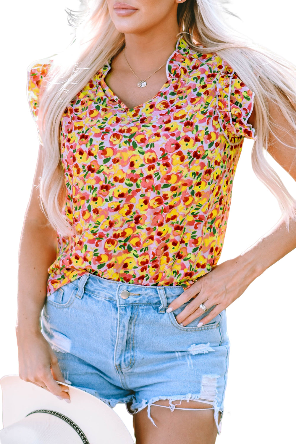 Yellow Floral Print Flutter Sleeve V Neck Tank Top