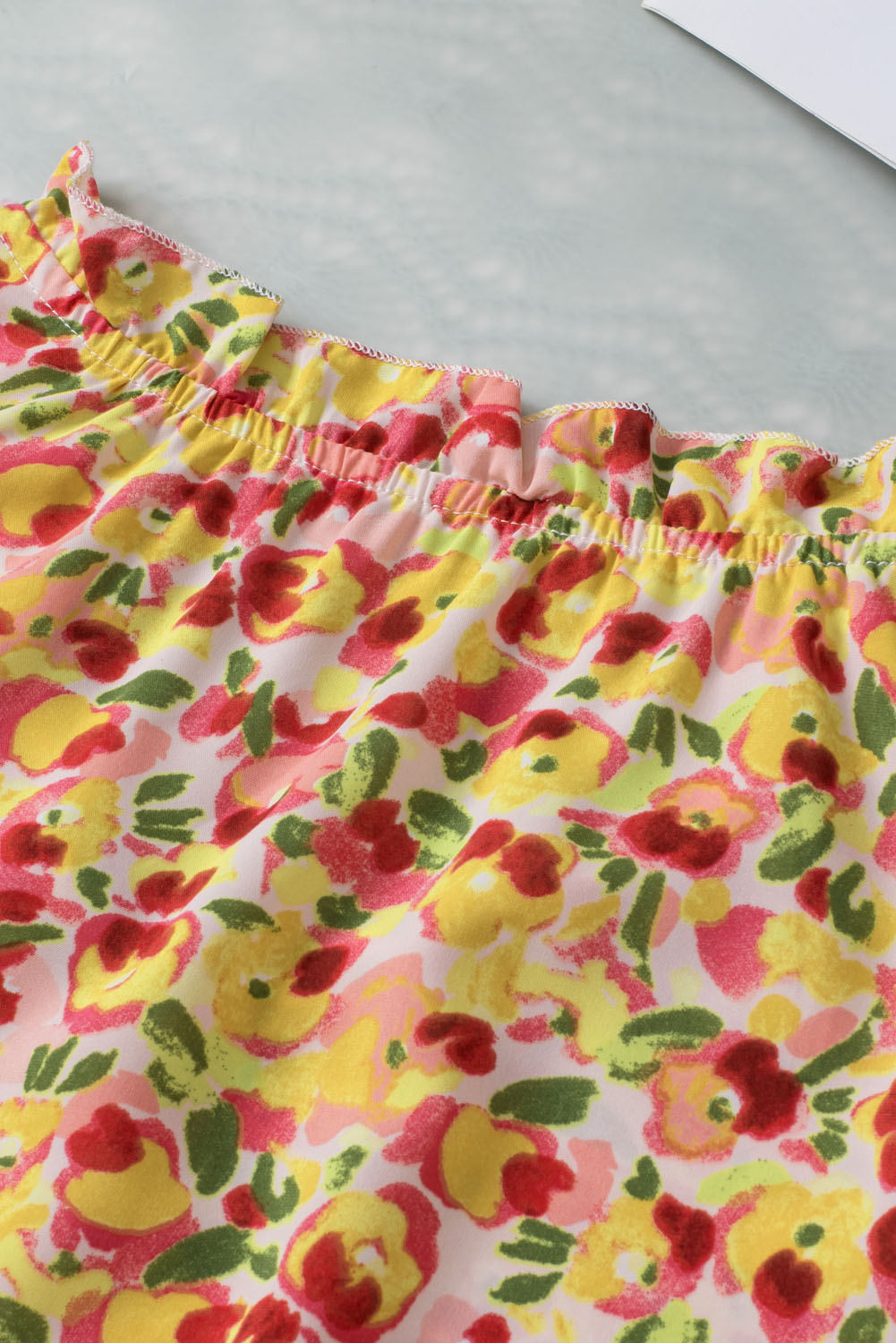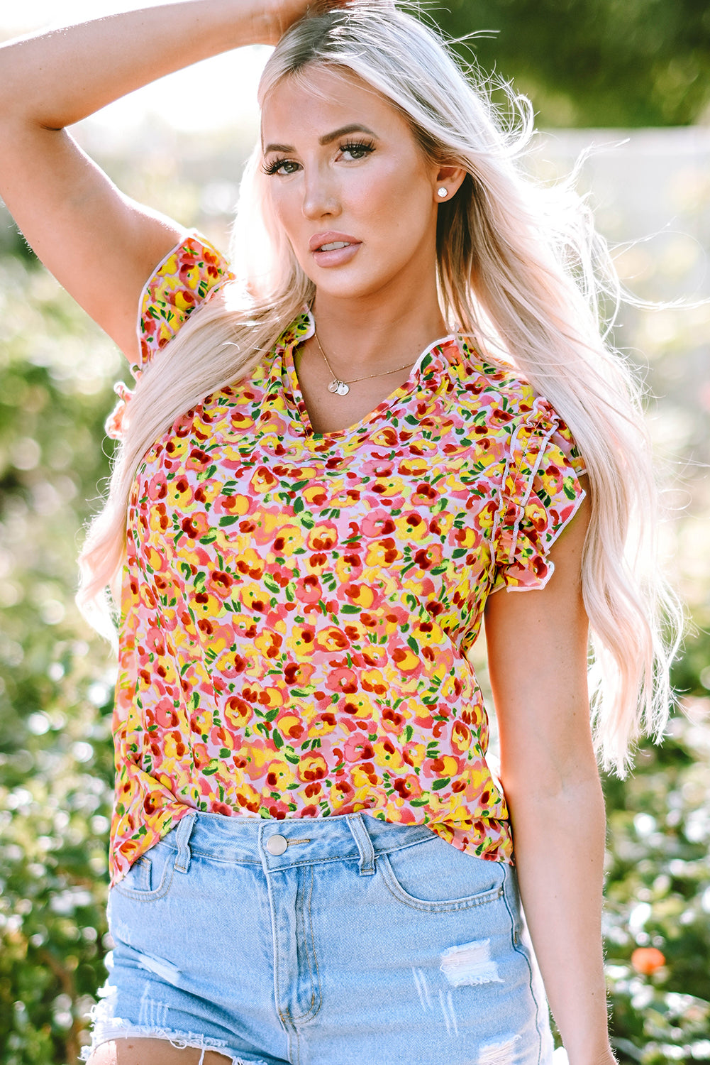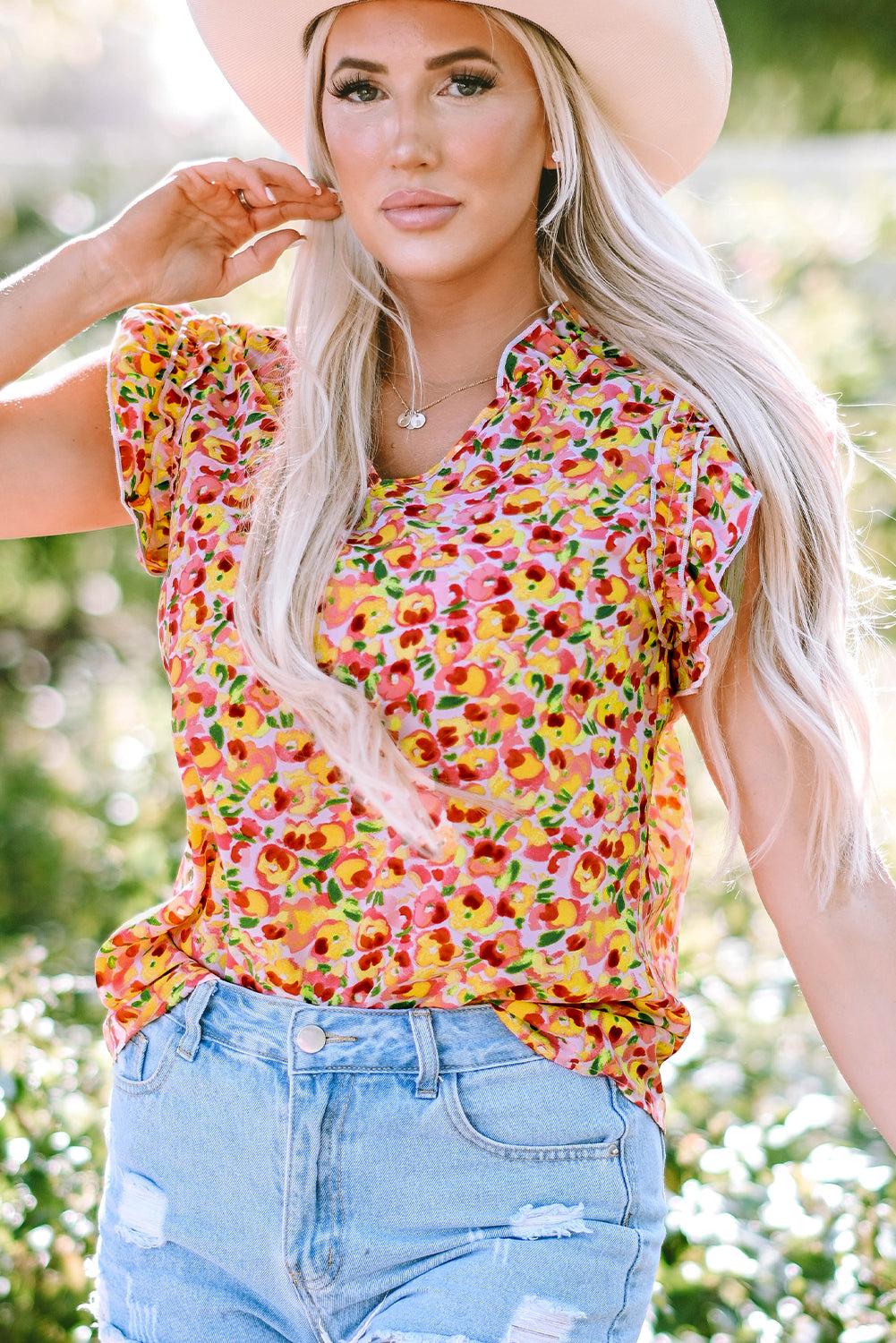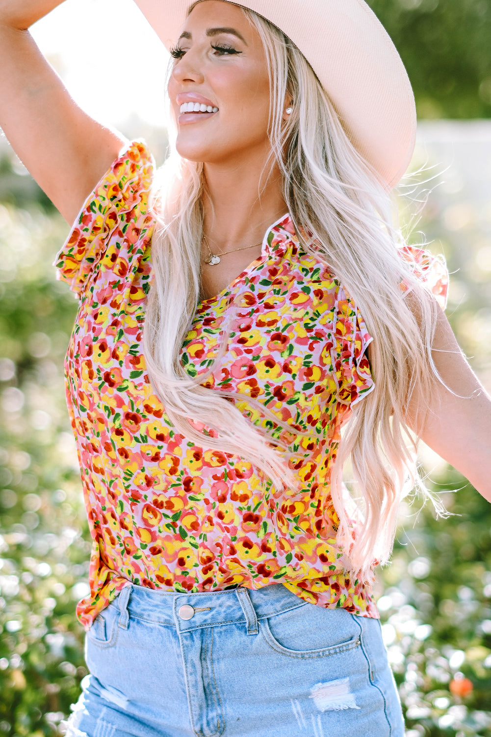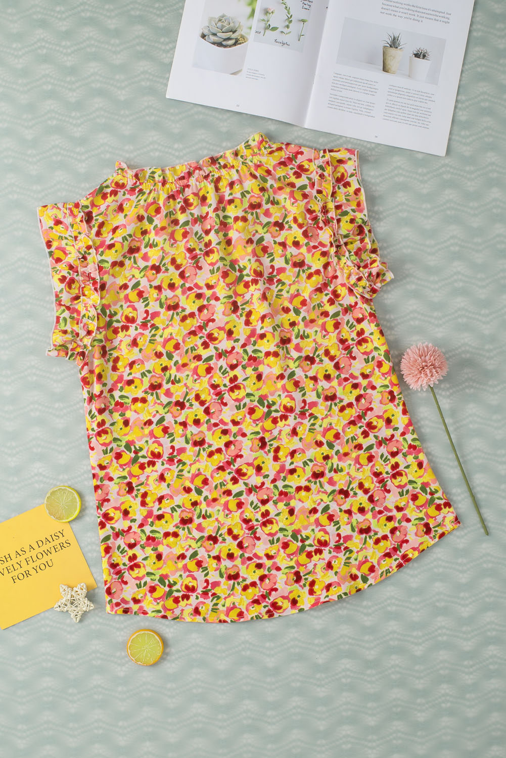 Yellow Floral Print Flutter Sleeve V Neck Tank Top